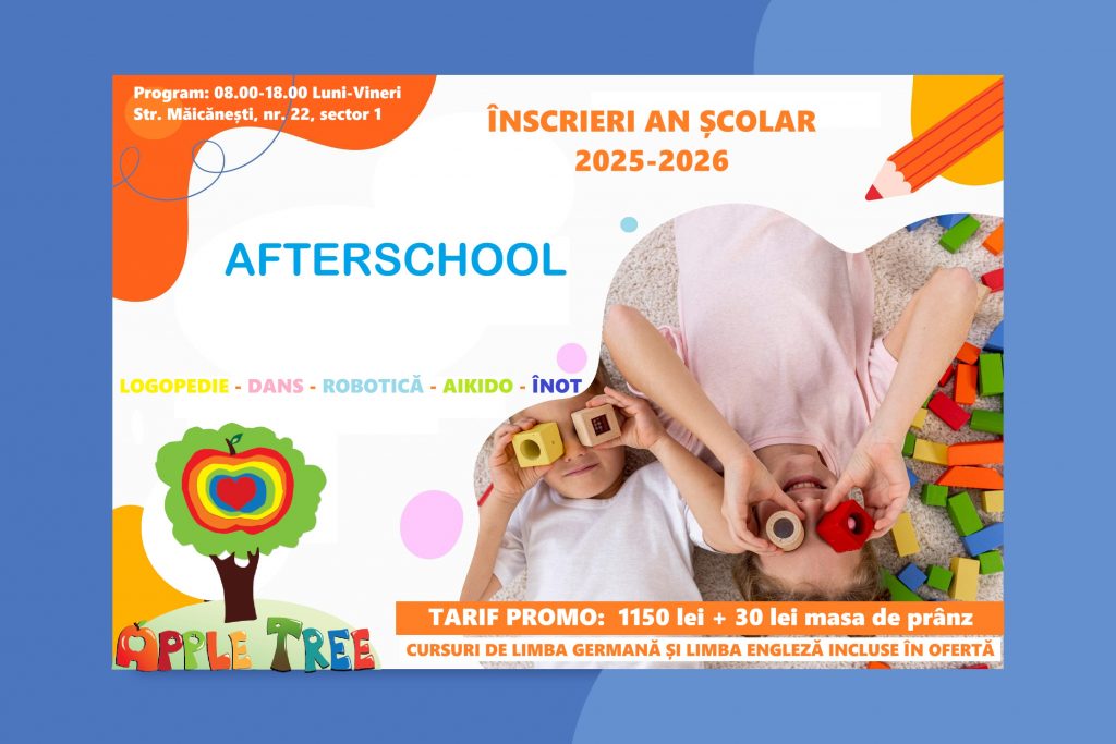 La Apple Tree Afterschool asigurăm preluarea copiilor de la şcoală, masa de prânz în sistem catering, studiul a două limbi străine (engleză, germană), efectuarea temelor sub supravegherea unui profesor pentru învăţământul primar, club de lectură, matematică distractivă, dezvoltare personală, activități opţionale.